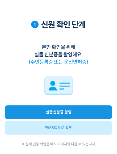 ※ 안면인증은 카메라로 실물 신분증과 얼굴을 비교해 확인하는 방식이라, 카메라가 정상적으로 작동하는 휴대폰이 필요합니다.